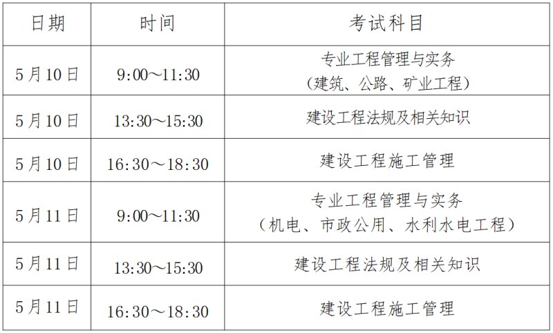 (二)考試時間:2025年5月10日至11日(2天)。建設(shè)工程法規(guī)及相關(guān)知識(閉卷考試,考試時間2小時);建設(shè)工程施工管理(閉卷考試,考試時間2小時);專業(yè)工程管理與實務(wù)(閉卷考試,考試時間2.5小時)。(詳見附件1)