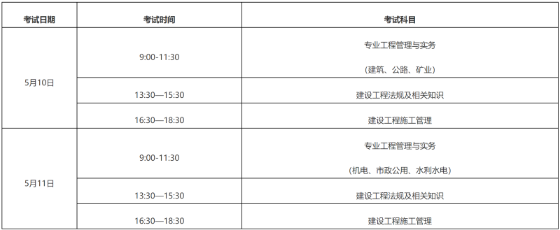 2.報考建筑工程、公路工程、礦業(yè)工程專業(yè)的考生只能在5月10日參加考試;報考市政公用工程、機(jī)電工程、水利工程專業(yè)的考生只能在5月11日參加考試。