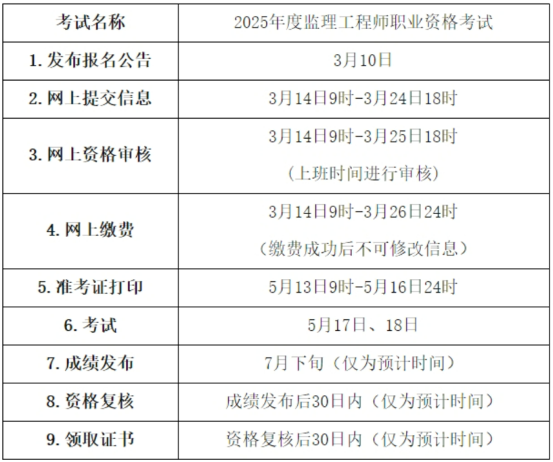 ?根據(jù)《人力資源社會保障部辦公廳關(guān)于2025年度專業(yè)技術(shù)人員職業(yè)資格考試工作計劃及有關(guān)事項的通知》(人社廳發(fā)〔2025〕1號),2025年度監(jiān)理工程師職業(yè)資格考試于5月17日、18日舉行?,F(xiàn)將有關(guān)事項通知如下: