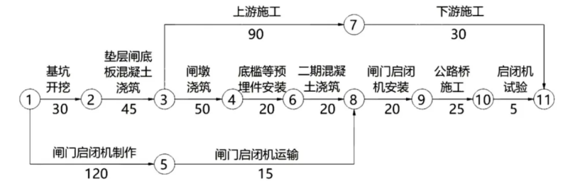 事件四:閘門及啟閉機安裝實際持續(xù)時間為 15 天;公路橋施工實際持續(xù)時間為20 天;按規(guī)范要求,啟閉機在現(xiàn)場進行了空載等試驗,試驗持續(xù)時間為 4 天。