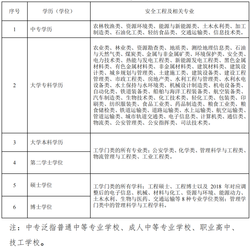 (三)為保證中級注冊安全工程師職業(yè)資格考試的平穩(wěn)過渡,新舊制度銜接按以下要求進(jìn)行:未選擇過報考專業(yè)類別的人員,報考時可根據(jù)所在單位行業(yè)類別,參考《注冊安全工程師職業(yè)資格制度規(guī)定》中“各專業(yè)類別注冊安全工程師職業(yè)行業(yè)界定表”(附件 1),選擇報考專業(yè)類別。已經(jīng)取得注冊安全工程師執(zhí)業(yè)資格證書或中級注冊安全工程師職業(yè)資格證書的人員(含中專學(xué)歷人員),可以報名參加其他專業(yè)類別考試(增報專業(yè))。
