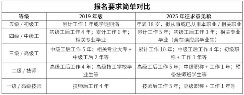 2025年征求意見稿:取消職業(yè)方向劃分,五個等級(五級/初級工至一級/高級技師)統(tǒng)一適用于所有從業(yè)者,無方向差異。