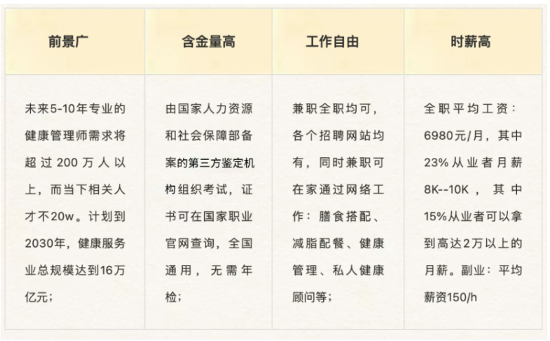 對(duì)于正在找工作的人來說,未來 5 到 10 年內(nèi),專業(yè)健康管理師的缺口預(yù)計(jì)將達(dá)到 200 萬人,這無疑是一個(gè)非常好的就業(yè)方向。健康管理師是一個(gè)可以做一輩子的黃金職業(yè),學(xué)習(xí)它能讓你更有能力從事健康行業(yè),工作更有價(jià)值。而對(duì)于想要?jiǎng)?chuàng)業(yè)的人來說,健康服務(wù)業(yè)的規(guī)模將會(huì)不斷擴(kuò)大,學(xué)習(xí)健康管理師是進(jìn)入這個(gè)行業(yè)的敲門磚,能幫你整合資源、建立人脈、拓展商業(yè)盈利模式、提升戰(zhàn)略思維。