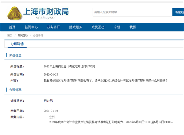 上海市財(cái)政局日前回復(fù)了考生提問,關(guān)于2021年初級(jí)會(huì)計(jì)考試準(zhǔn)考證打印時(shí)間的問題有了準(zhǔn)確的答復(fù),上海市2021年初級(jí)會(huì)計(jì)考試準(zhǔn)考證打印時(shí)間定于:2021年5月10日10:00至5月12日24:00,回復(fù)詳情如下: