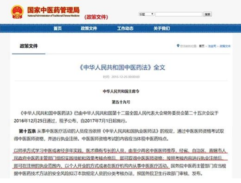2017年7月1日,《中醫(yī)藥法》正式實(shí)施,第十五條中規(guī)定:師承和確有專長人員通過考核即可獲得中醫(yī)醫(yī)師資格,憑《中醫(yī)(專長)醫(yī)師資格證》即可備案中醫(yī)診所或者在醫(yī)療機(jī)構(gòu)從業(yè)。