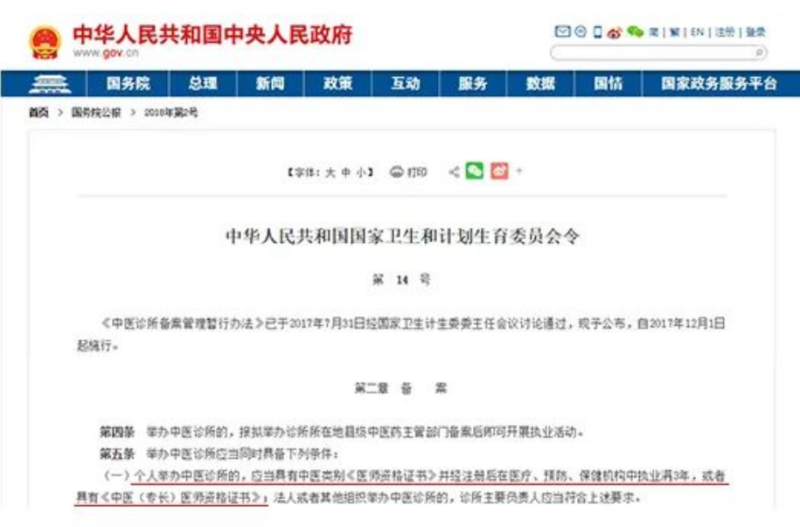 2017年12月1日,國家衛(wèi)計(jì)委14號文件《中醫(yī)診所備案管理暫行辦法》正式實(shí)施,規(guī)定:個(gè)人舉辦中醫(yī)診所的,應(yīng)當(dāng)具有中醫(yī)類別《醫(yī)師資格證書》并經(jīng)注冊后在醫(yī)療、預(yù)防、保健機(jī)構(gòu)中執(zhí)業(yè)滿三年,或者具有《中醫(yī)(專長)醫(yī)師資格證書》;法人或者其他組織舉辦中醫(yī)診所的,診所主要負(fù)責(zé)人應(yīng)當(dāng)符合上述要求。