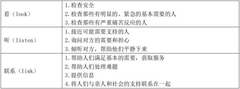 心理急救的行動原則有三條:一看(Look)、二聽(Listen)、三聯(lián)系(Link),即三“L”原則。