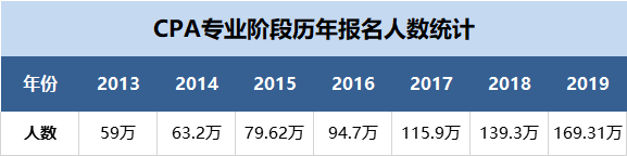 很多會(huì)計(jì)的考證路是:會(huì)從→初級(jí)→中級(jí)→高級(jí)……,一步一個(gè)證書,想越級(jí)考很困難,報(bào)名條件都達(dá)不到。但是注冊(cè)會(huì)計(jì)師,相對(duì)來(lái)說(shuō),報(bào)名要求很低,不要求工作經(jīng)驗(yàn)、專業(yè)不限制,大學(xué)應(yīng)屆畢業(yè)生都可以參加。以下是歷年報(bào)名人數(shù)統(tǒng)計(jì):