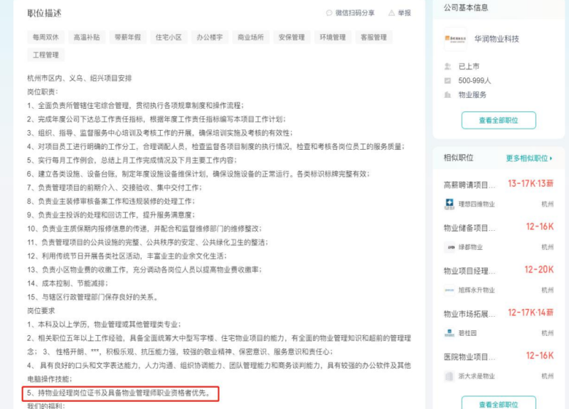 多家大型企業(yè)、上市公司在相關崗位招聘時,明確表示持有物業(yè)經(jīng)理證書的人員優(yōu)先,在同等人員中更具職業(yè)競爭力,是物業(yè)管理人員升職加薪的重要依據(jù)。