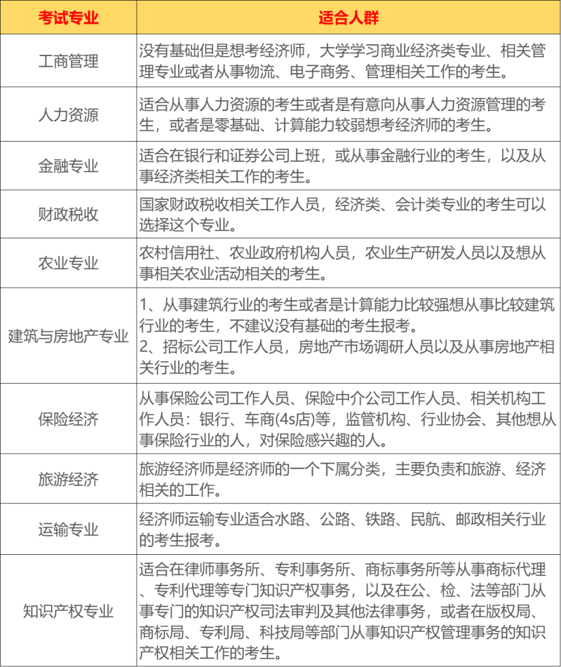 中級(jí)經(jīng)濟(jì)師報(bào)考專業(yè)及適合人員解讀如下表:
