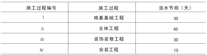 項(xiàng)目經(jīng)理部根據(jù)工序合理、工藝先進(jìn)的原則確定了施工順序。本項(xiàng)目各單體建筑共由4 個(gè)施工過程組成,分 別為:地基基礎(chǔ)工程、主體工程、裝飾裝修工程、安裝工程。每個(gè)施工過程組建 1 個(gè)專業(yè)工作隊(duì),各施工過程的 流水節(jié)拍見表 1.
