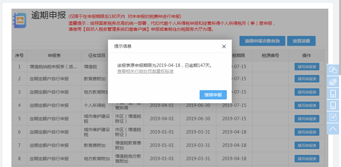 點(diǎn)擊“填寫申報(bào)表”,系統(tǒng)提示納稅人未申報(bào)已逾期天數(shù)。