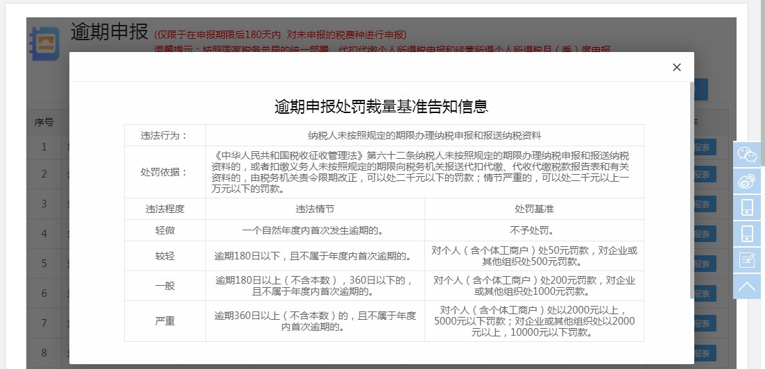 點(diǎn)擊“查看相關(guān)行政處罰裁量權(quán)基準(zhǔn)”,可查看逾期申報(bào)處罰裁量基準(zhǔn)告知信息。