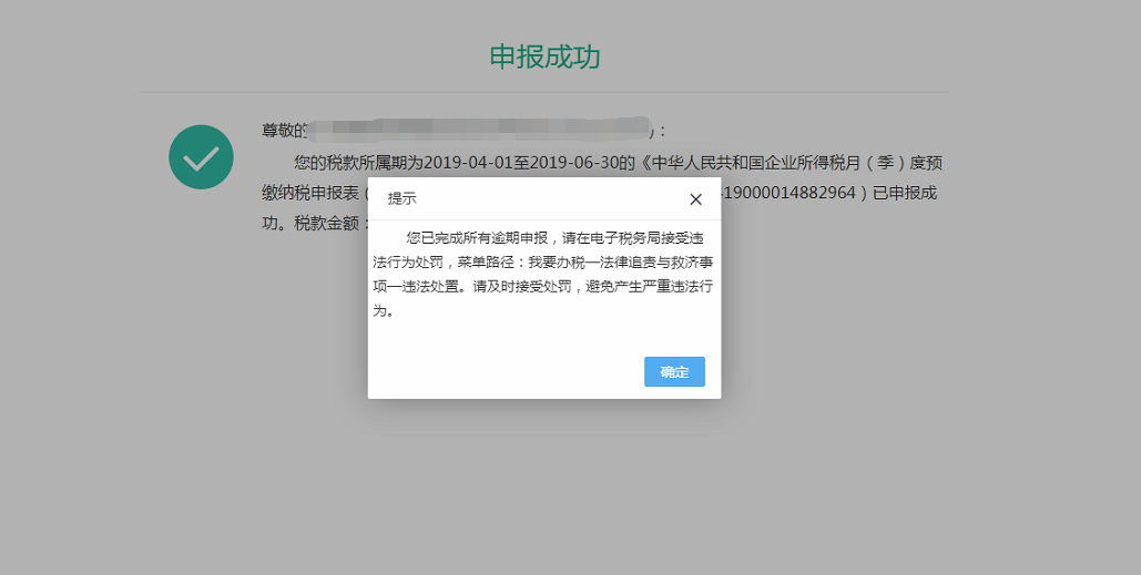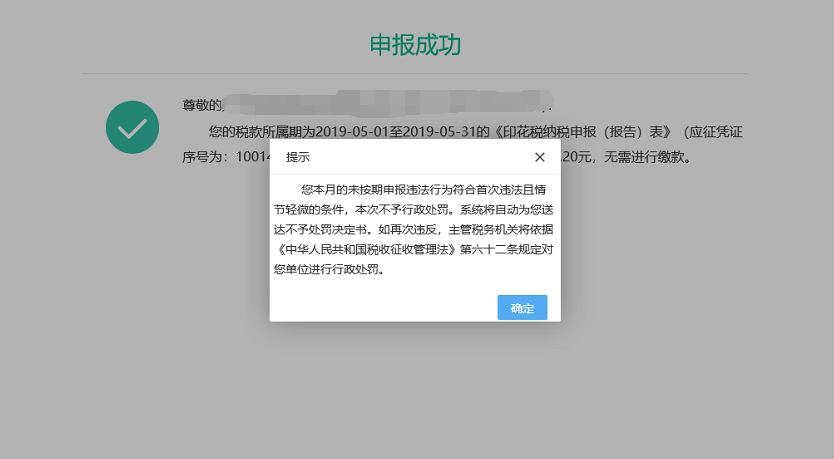 如納稅人辦理“非首違”的逾期申報(bào)后,核心征管系統(tǒng)未生成相關(guān)數(shù)據(jù)的,需要納稅人到前臺(tái)辦理違法處罰事項(xiàng)。申報(bào)成功后的提示如圖: