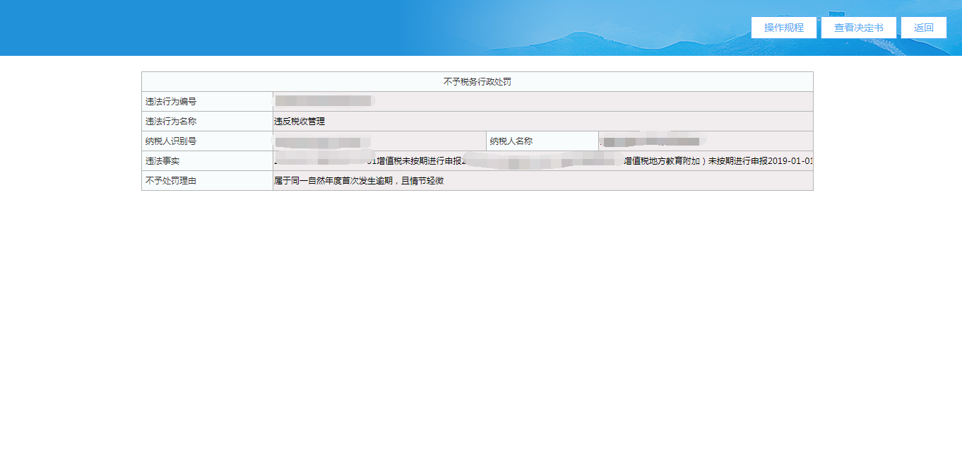 點(diǎn)擊提示框“確定”按鈕,系統(tǒng)自動(dòng)跳轉(zhuǎn)至【逾期申報(bào)違法處置】功能。系統(tǒng)自動(dòng)送達(dá)、展示逾期申報(bào)不予稅務(wù)行政處罰信息。