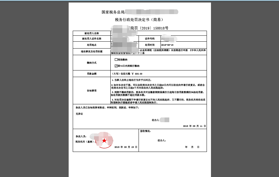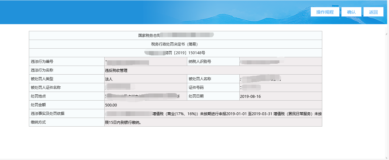 點(diǎn)擊“查看決定書”,系統(tǒng)自動(dòng)展示稅務(wù)行政處罰決定書(簡易)。