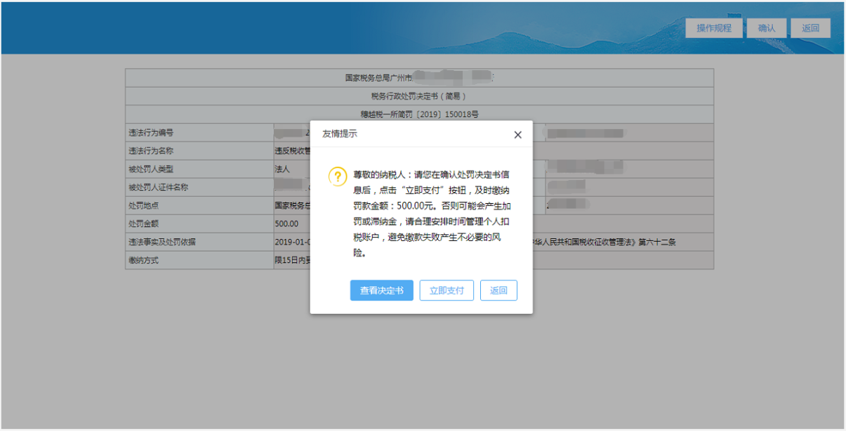 點(diǎn)擊“確認(rèn)”,系統(tǒng)彈框提示納稅人需要接受處罰金額。納稅人可點(diǎn)擊“查看決定書”下載、打印文書,或點(diǎn)擊“立即支付”繳納罰款。