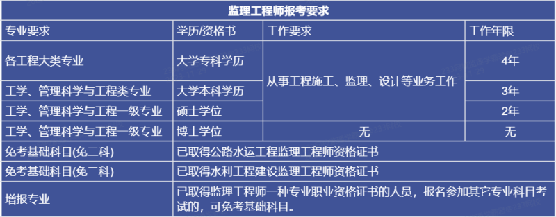要報考監(jiān)理工程師,需要滿足一定的學(xué)歷和工作經(jīng)驗(yàn)要求。如果考生擁有各工程類專業(yè)的大學(xué)??茖W(xué)歷(或高等職業(yè)教育學(xué)歷),且在工程施工、監(jiān)理、設(shè)計等領(lǐng)域工作滿4年,即可報考。而擁有工學(xué)或管理科學(xué)與工程類專業(yè)的本科學(xué)歷或?qū)W位,并在相關(guān)領(lǐng)域工作滿3年者,同樣有資格報考。若考生擁有工學(xué)或管理科學(xué)與工程一級學(xué)科的碩士學(xué)位或?qū)I(yè)學(xué)位,只需在相關(guān)領(lǐng)域工作滿2年即可參加考試。擁有工學(xué)或管理科學(xué)與工程一級學(xué)科的博士學(xué)位的考生也具備報考資格。 >>>點(diǎn)擊進(jìn)入監(jiān)理工程師考試預(yù)約報名入口>>>