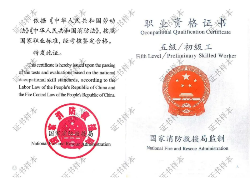 新版消防行業(yè)職業(yè)資格證書封二、內(nèi)一式樣(五級(jí)/初級(jí)工) >>>點(diǎn)擊進(jìn)入消防設(shè)施操作員預(yù)約報(bào)名入口>>>