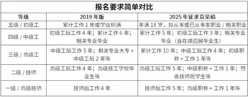 2025年征求意見稿:取消職業(yè)方向劃分,五個(gè)等級(五級/初級工至一級/高級技師)統(tǒng)一適用于所有從業(yè)者,無方向差異。