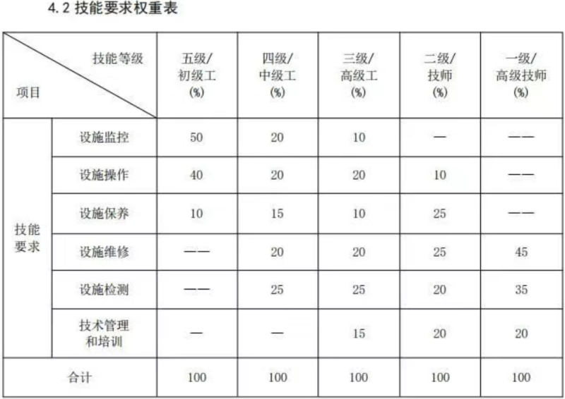 設(shè)施維修/檢測占比:從四級開始逐步提升,一級/高級技師各占30%。