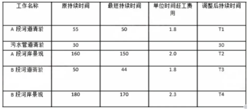 2.事件二中,分別指出A、B 段護岸混凝土兩項工作實際進度比計劃進度延誤了多少天?按費用增加最少原則,分別指出表2中T1、T2、T3、T4所對應的天數。